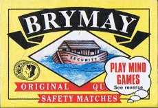 Altmodische Streichholzschachtel der Firma Brymay, eingelegt ist das Foto einer Person in Korsett, Strümpfen bis zum Oberschenkel und Stöckelschuhen. Die Brüste liegen frei, jedoch mit abgeklebten Nippeln. Dazu wird Kurzhaarfrisur und Schnurbart getragen.