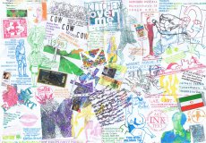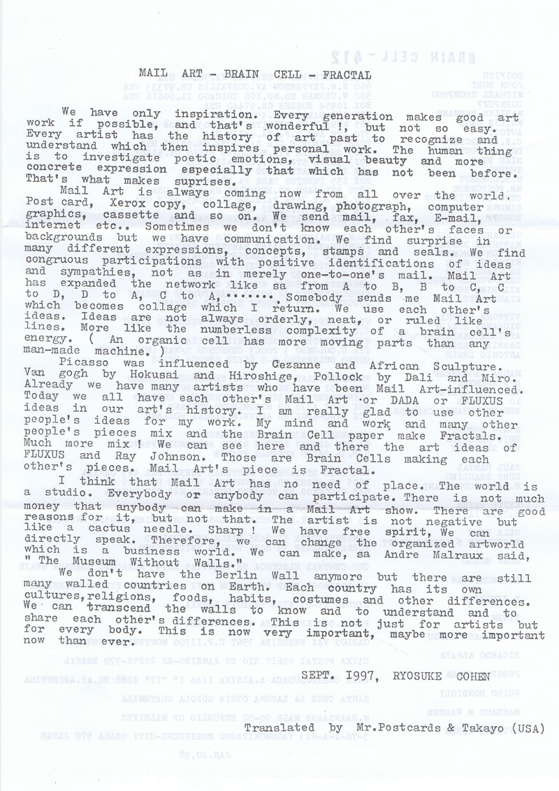 Xerox, bestempelt, mit Aufklebern und Ausschnitten beklebt, dreifach gefaltet, in Briefumschlag, beigelegt eine Auflistung der teilnehmenden Künstler*innen, rückseitig ein Text über Mail Art von Cohen "Mail Art - Brain Cell - Fractal", übersetzt ins Englische von Mr. Postcards und Takayo