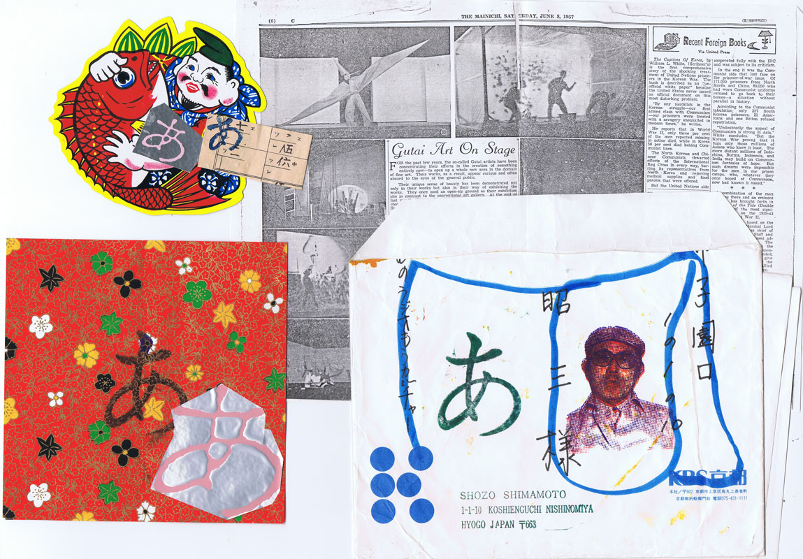 • Brief adressiert an Kattenstroth, Stempel, Künstlerstempel, 3 A4 Schwarz-Weiß Kopien von Zeitungsartikeln über Gutai Art aus "The Mainichi" und "lightworks"; A3 Schwarz-Weiß Kopie "Gutai as an exceptional Group"; Poststempel 1985