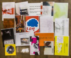 • Brief vom 01.08.1984 an Kattenstroth, Aufkleber auf dem Umschlag, teils coloriert; US Letter, zweifach gefaltet, handschriftlicher Brief, signiert; Flyer "Lake Shadows", 21,7x10,3cm, 1981 The Summer Solstice; Postkarte "Bern Porter", nicht versandt, 1980; 2 Streifen Aufkleber mit Text und Illustration, coloriert, gestempelt; US Letter, Schwarz-Weiß Xerox "Oh God, yes", collagiert, gestempelt, signiert, Datierung 1984