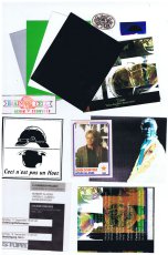 Zigarillo-Blechdose, beklebt mit X, 3 Aufkleber, farbige Xerox-Kopien zu "1 Jahr Neuer Kasseler Kunstverein" , verschiedene Größen, 3 monochrome Papierkarten, 1 Sammelkarte mit Porträt von Achim Schnyder