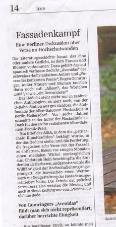 ... Die Literaturgeschichte kennt das eine oder andere Gedicht, in dem Frauen und Blumen vorkommen. Dazu gehört das auf spanisch verfasste Gedicht „Avenidas“ des schweizer-bolivianischen Autors und „Vaters der konkreten Poesie“, Eugen Gomringer. Außer Frauen und Blumen tauchen darin noch auf: „Alleen“, das Wörtchen „und“, sowie „ein Bewunderer“. ...