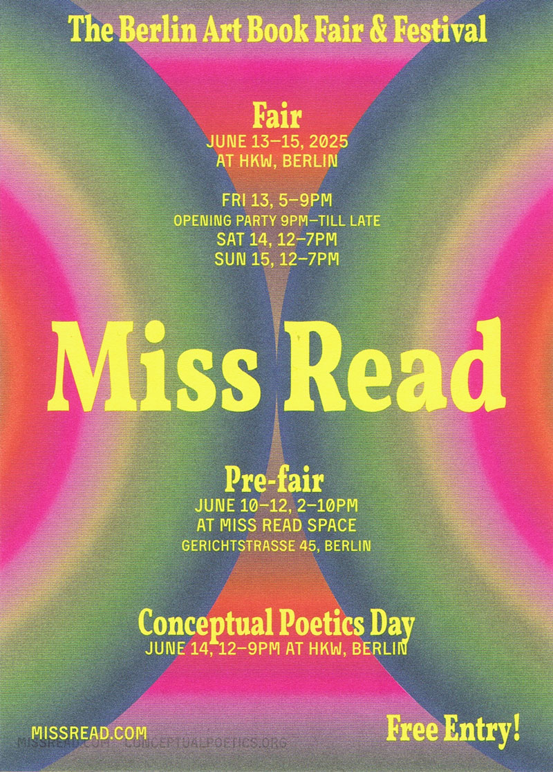 Postkarte zur Künstlerbuchmesse Miss Read Berlin, Haus der Kulturen der Welt, 13.06.–15.06.2025.