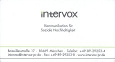 intervox kommuniziert für Soziale Nachhaltigkeit. Strategisch oder operativ, als Dienstleisterin für ihre KundInnen. Die kleine Agentur arbeitet mit einem großen, eingespielten Netzwerk an Medienkontakten und Projektpartnern. Sie ist eine der ältesten, inhabergeführten Kommunikations-Agenturen Deutschlands. Gegründet 1966 in München.