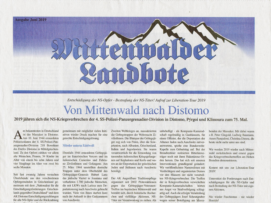U.a. Artikel zu NS-Kriegsverbrechen, Ankündigung der sog. Liberation-Tour 2019 von Mittenwald nach Distomo, Neonazis in Uniform und ein doppelseitiger Auszug aus Lissbeth Lutters Anti-Heimat-Krimi "Hinterwald"