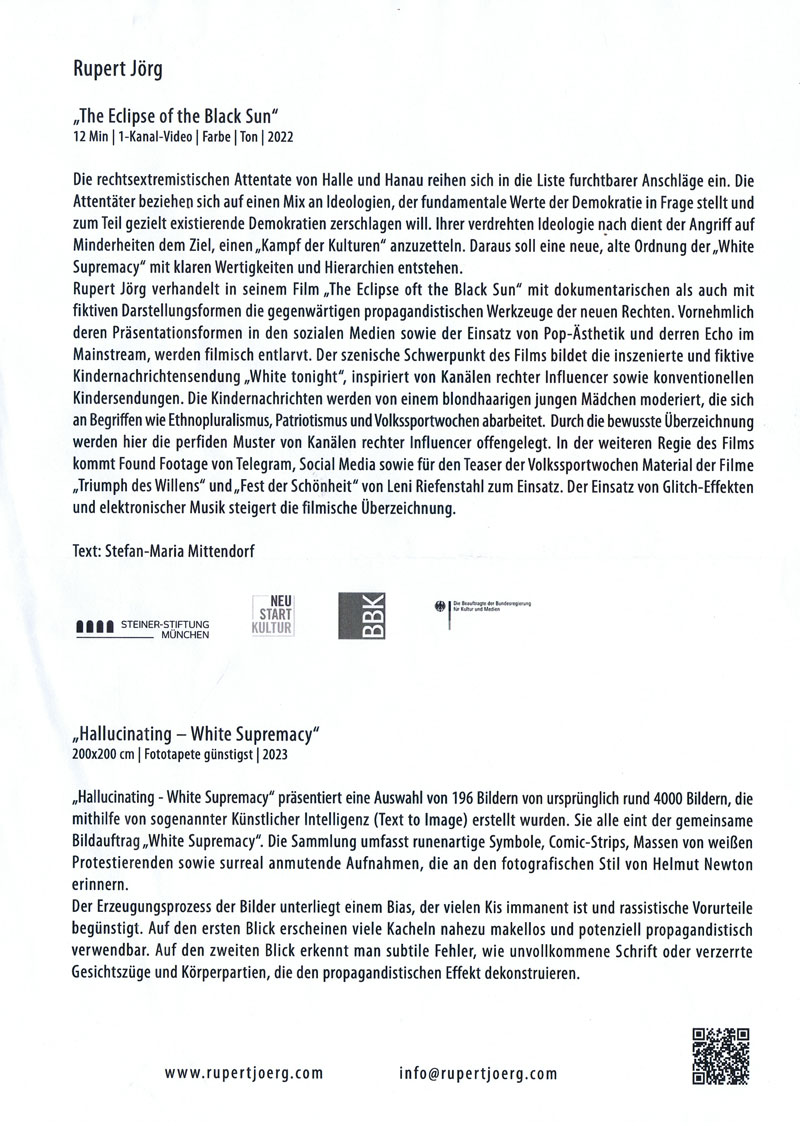 In der Videocollage "Die Finsternis der schwarzen Sonne" wurden die Ästhetik und Sprache der zeitgenössischen neofaschistischen Propaganda untersucht. Gefundenes Filmmaterial aus Social-Media-Kanälen von Neonazi-Gruppen und Verfechtern von Verschwörungstheorien wurde in eine inszenierte Kindernachrichtensendung eingebettet. video 12 Min, 1-Kanal, Farbe, Ton, 2022